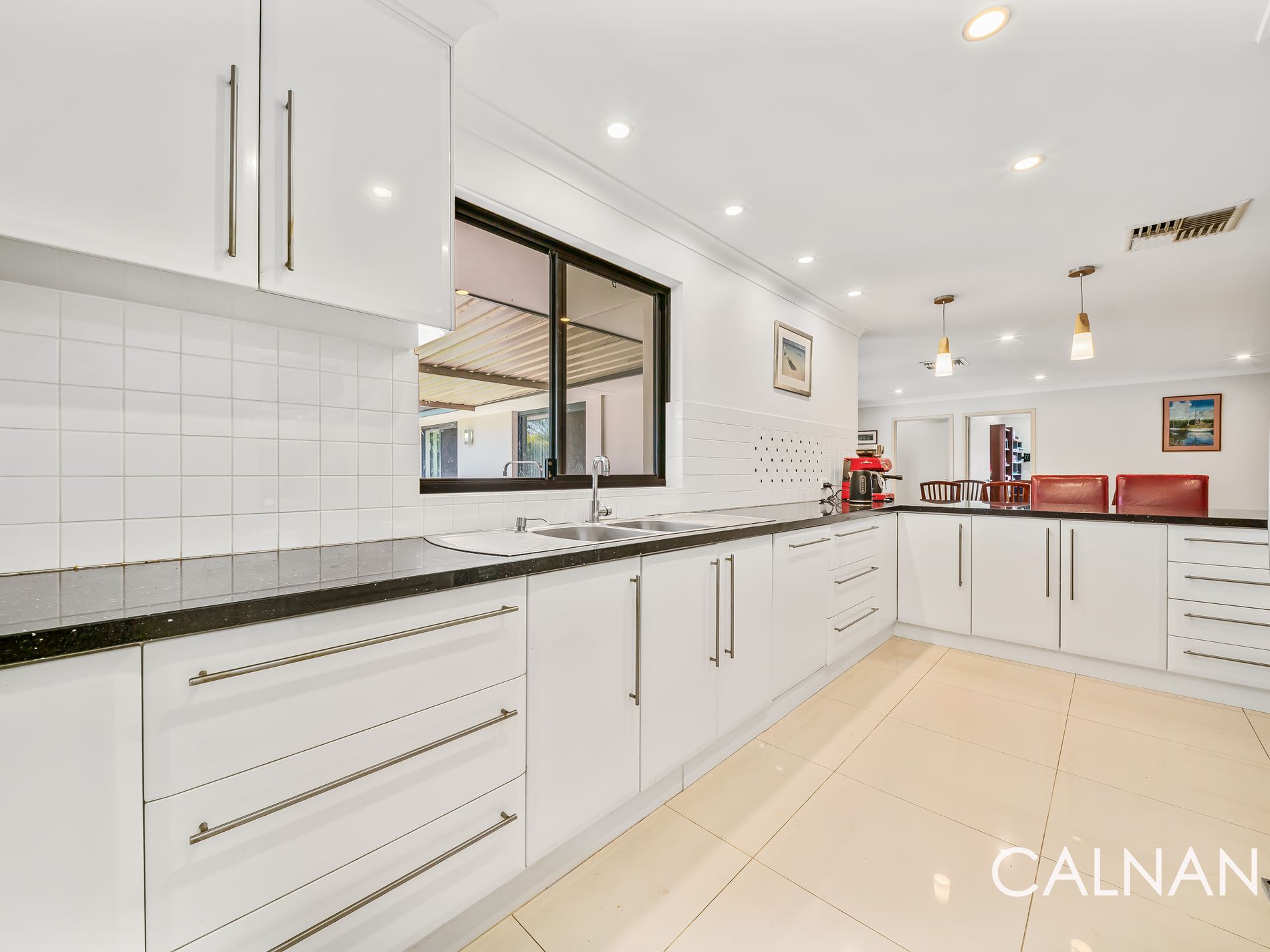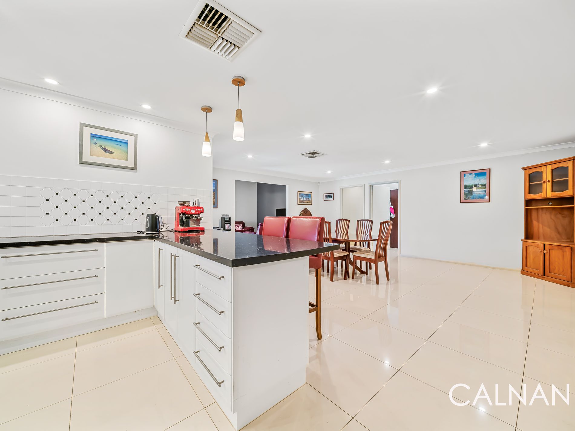 At the heart of the home, the open plan kitchen, dining and family area creates a welcoming central hub for everyday living. The well-appointed kitchen features sleek Caesarstone benchtops, ample storage and generous preparation space, perfectly positioned to overlook the main living zones and outdoor entertaining area.
