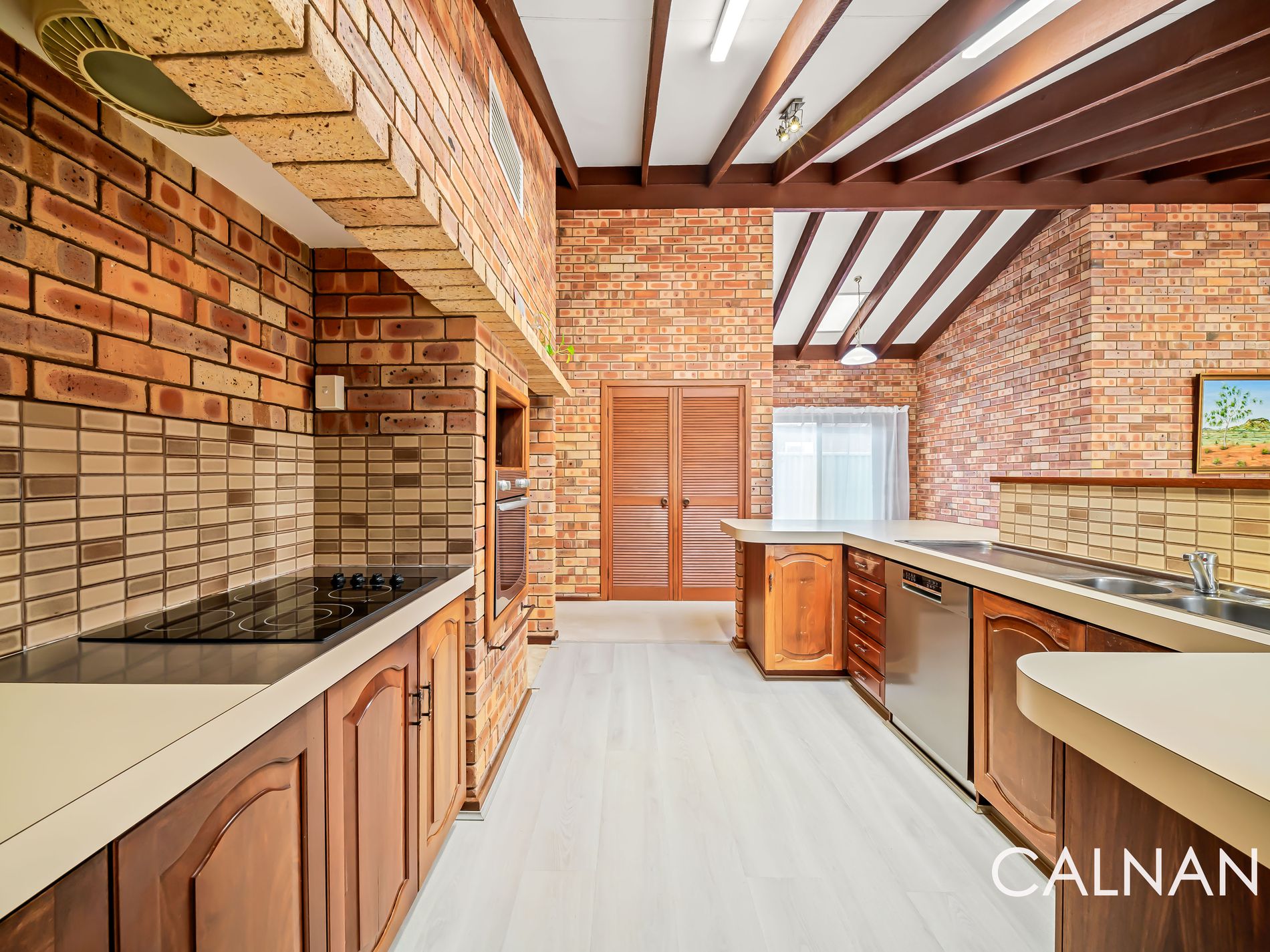 High raked ceilings with exposed brick and timber beams add character to the casual living areas, paying homage to the home’s retro charm while offering generous internal space throughout.