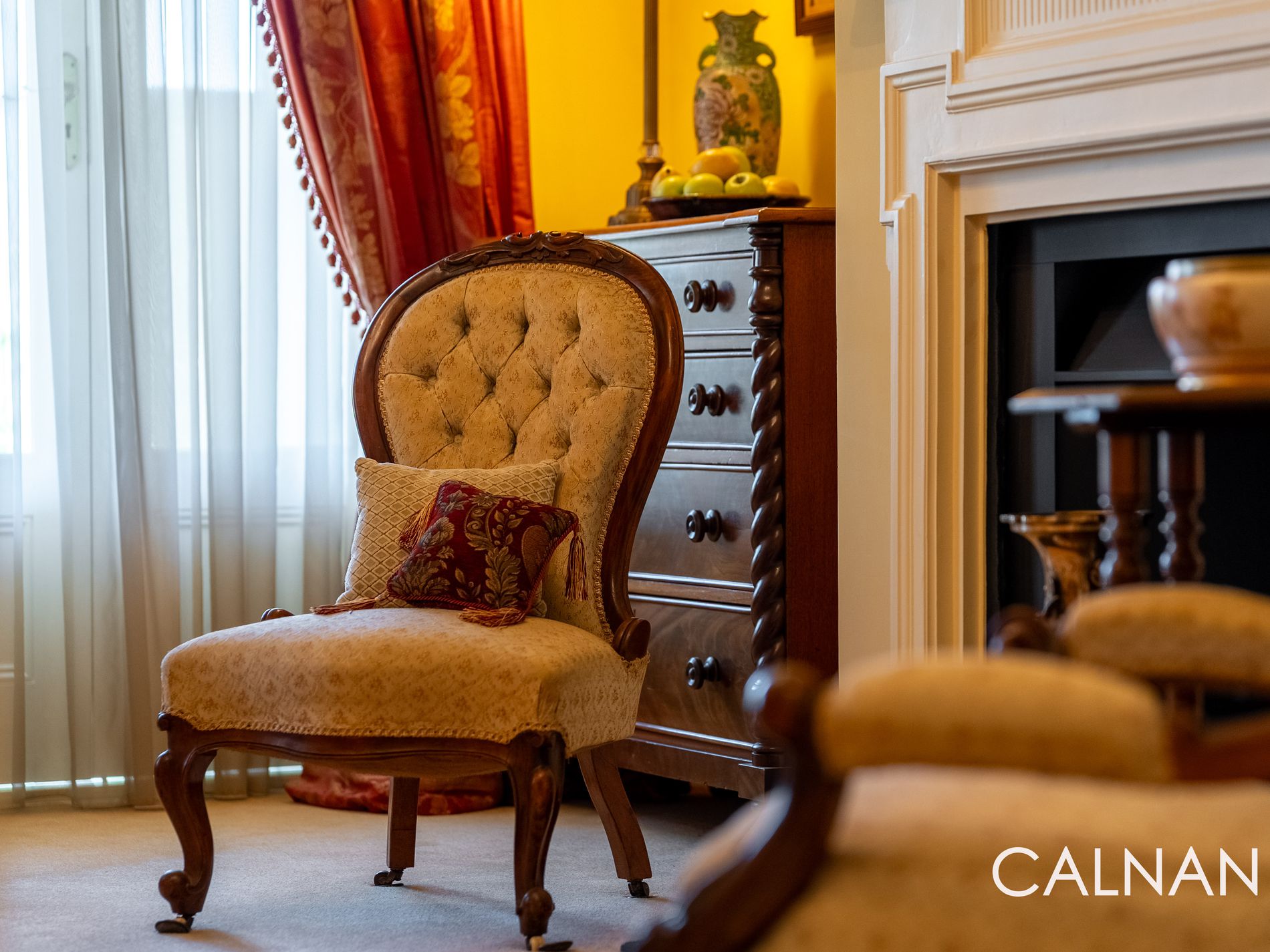 There is a separate toilet within this part of the layout, alongside a giant second bedroom.Folding doors reveal a spacious formal lounge room with carpet, a striking ceiling rose, antique curtains, a French light fitting, a cast-iron moulded wood fireplace and two sets of double doors that flow out to the verandah – Darling Range views and all.