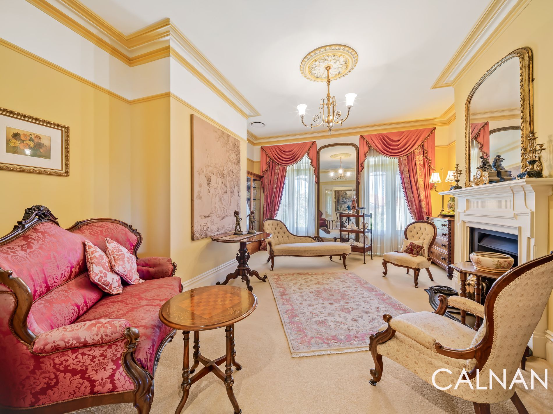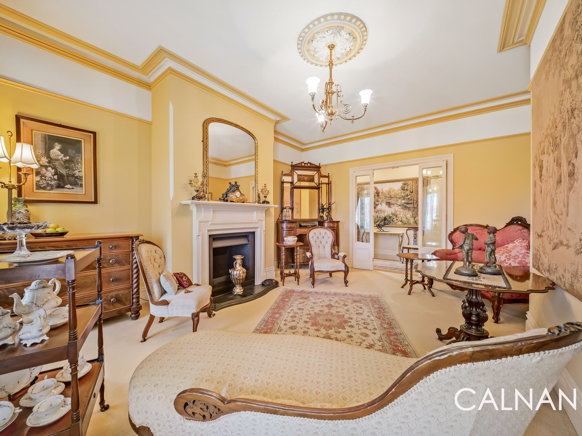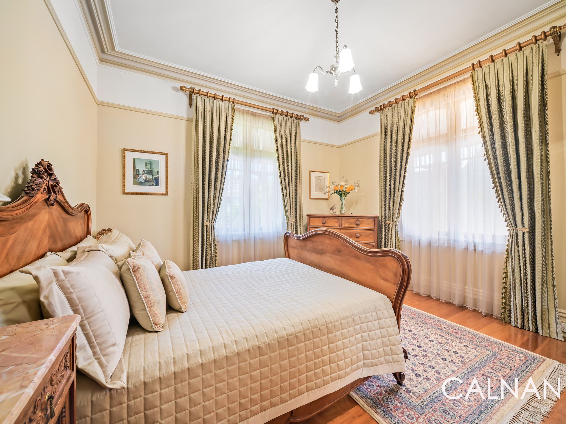 The expansive master retreat also plays host to beautiful antique curtains, with an antique light fitting and three doors of built-in robes complemented by a fully-tiled ensuite – comprising of a marble vanity and marble floor tiles, a shower, toilet and sublime sash window that lets the fresh air in.