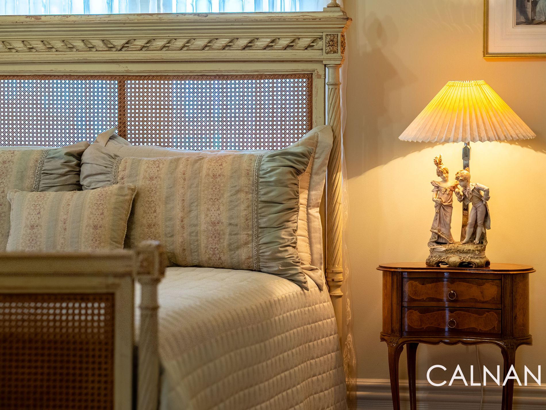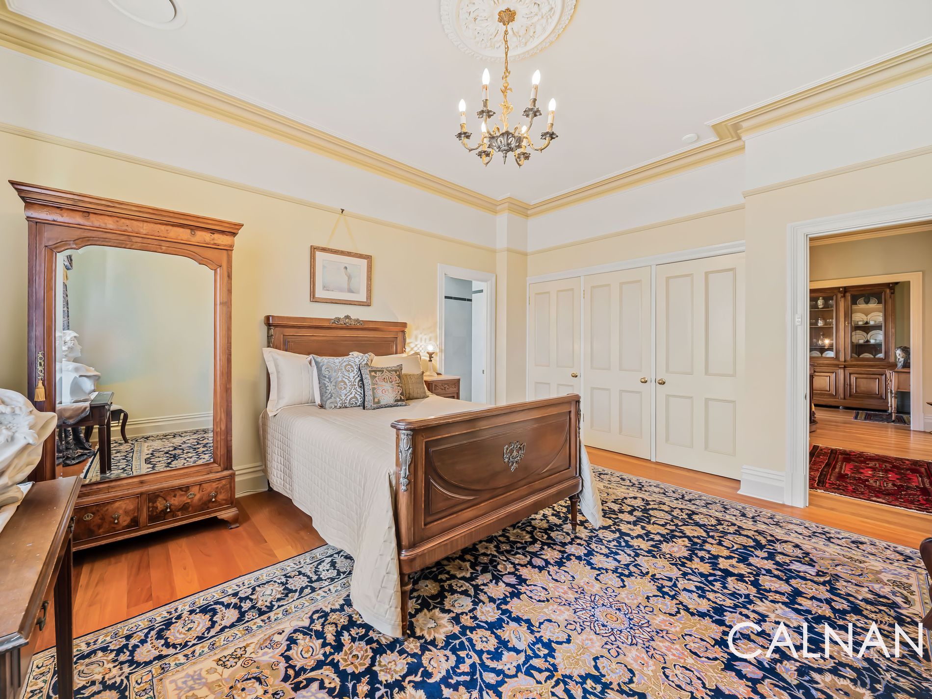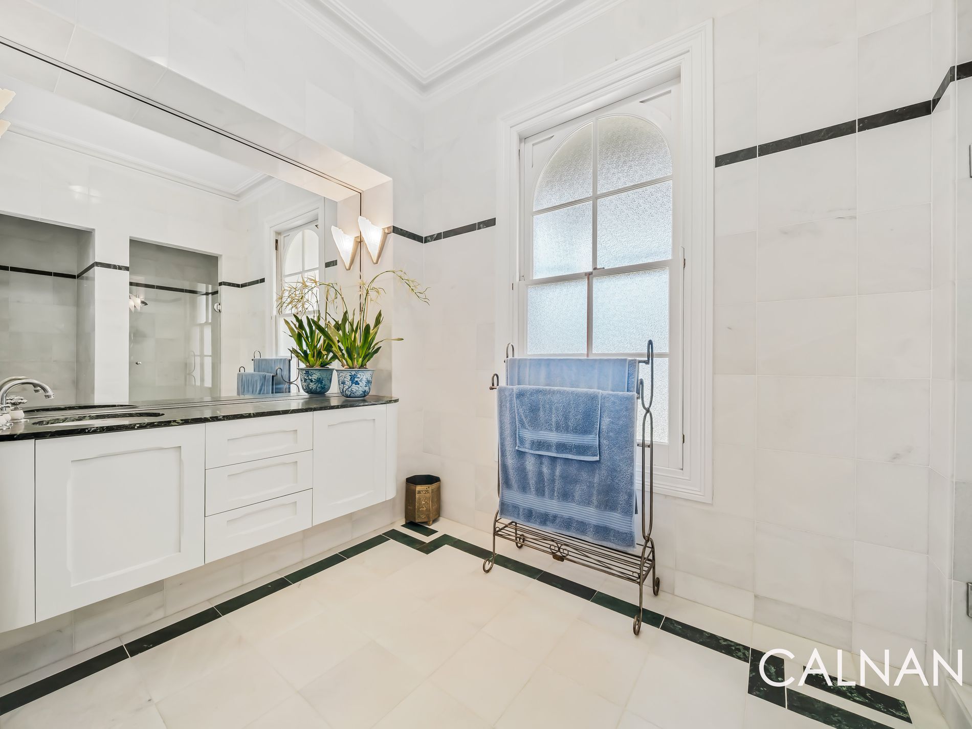 The expansive master retreat also plays host to beautiful antique curtains, with an antique light fitting and three doors of built-in robes complemented by a fully-tiled ensuite – comprising of a marble vanity and marble floor tiles, a shower, toilet and sublime sash window that lets the fresh air in.